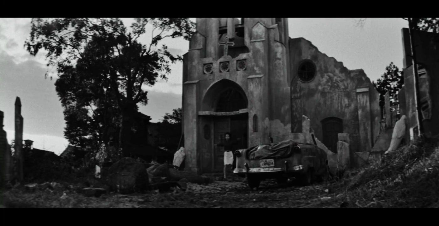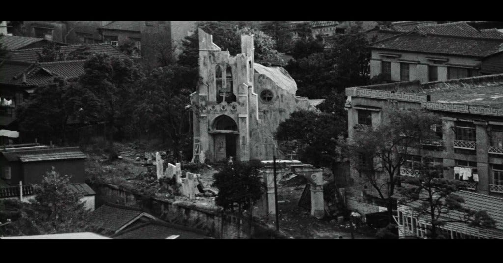 The church’s major claim to fame, so to speak, is its appearance in the 1964 film Black Sun. By that time, it was falling to pieces and cut a stark, eerie figure amid the bustling new city reborn after the war. The film portrays the complex relationship between a jazz-obsessed Japanese drifter and thief who lives in the church and an African-American soldier on the run from the police, and the place serves as a significant backdrop, symbolizing the cultural and emotional intersections between the two men, underscoring themes of alienation, redemption, and the search for connection in postwar Japan.
